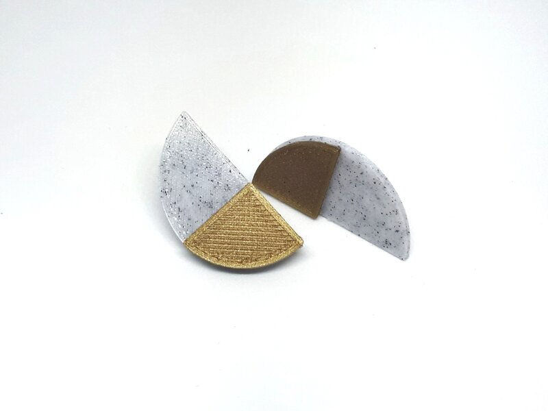 Gli orecchini sono stati disegnati in 3D con un programma di modellazione e stampati con una stampante 3D. Ogni pezzo risulta unico grazie alla lavorazione artigianale che accompagna la stampa 3D.